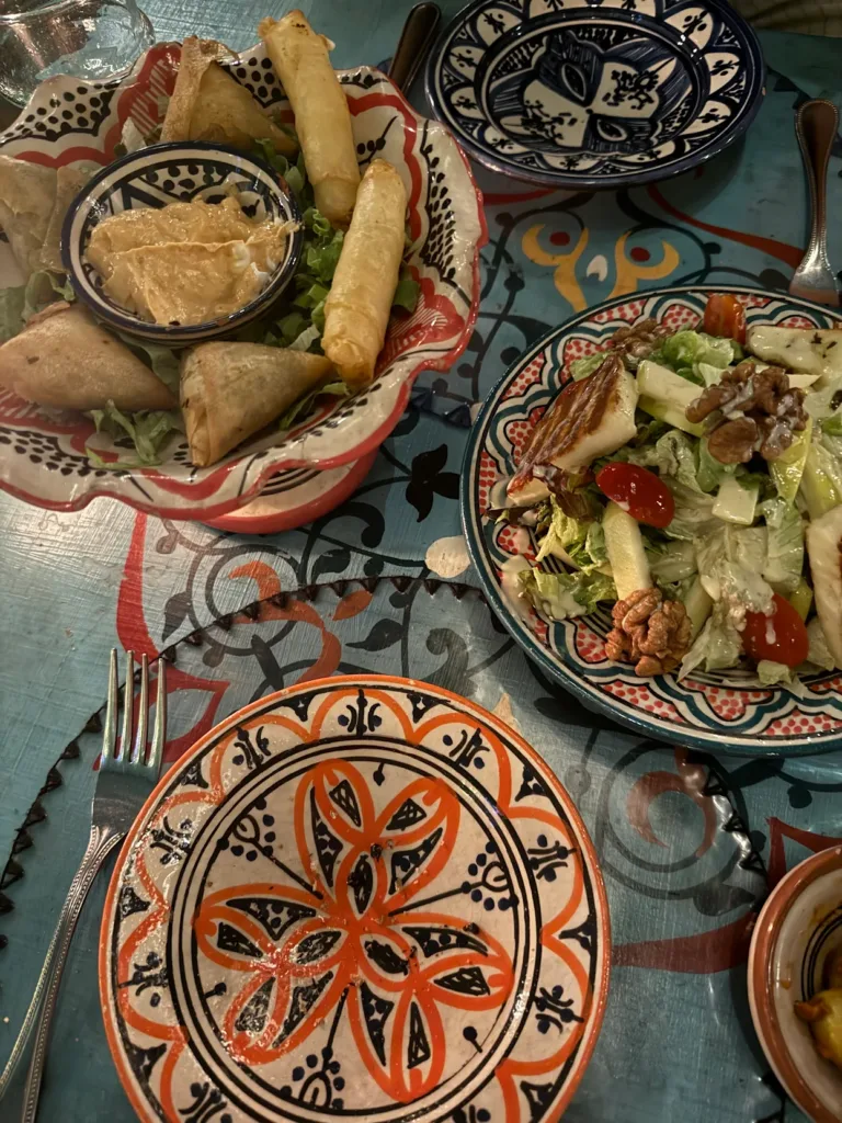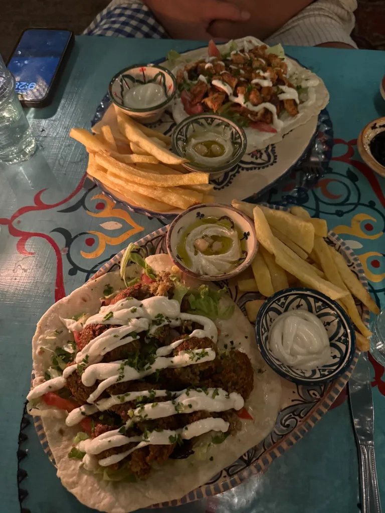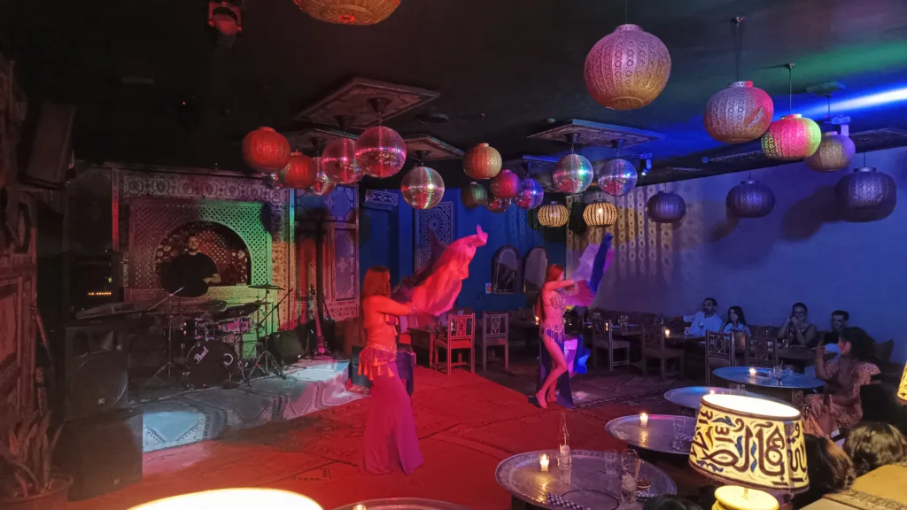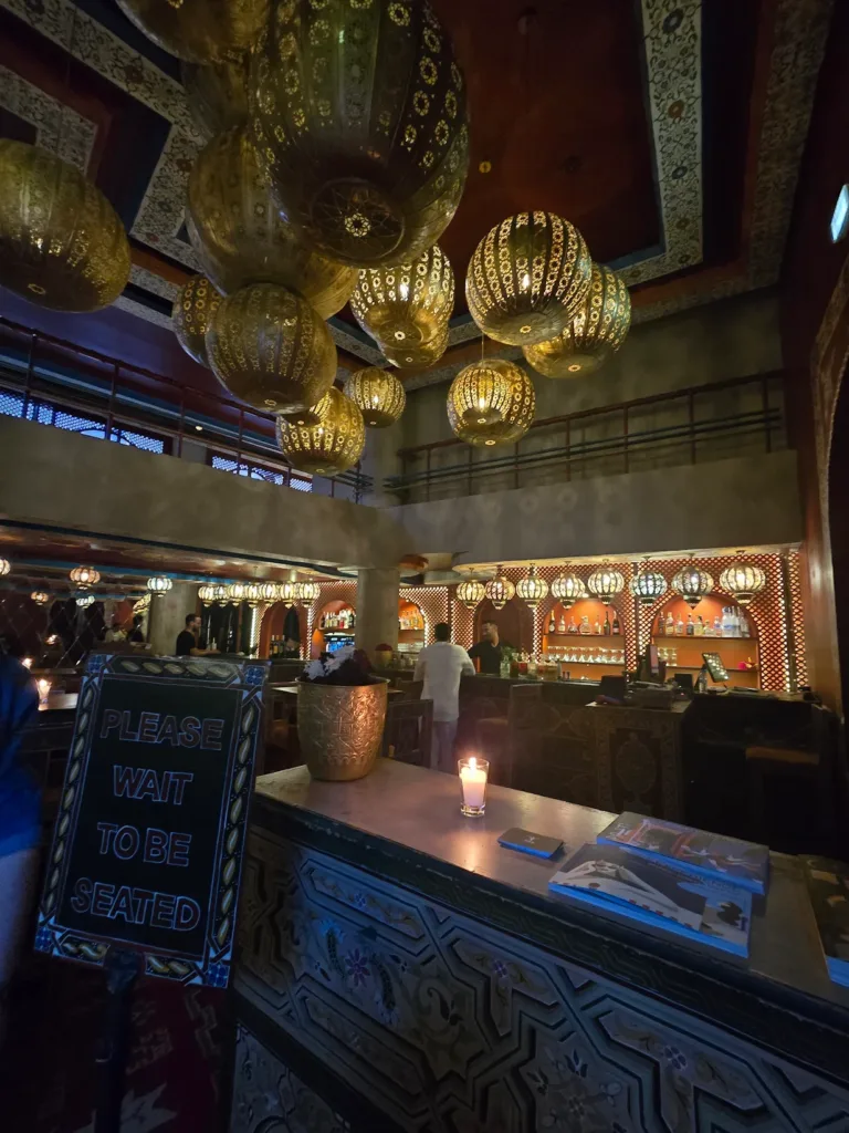 The atmosphere is fantastic. I would say this is a great place to get a drink or dessert and stay out…enjoy the shows. They have a full bar menu and mocktails. I dont know that I recommend the food based on my experience. A lot of people were ordering tagine. I was curious on how they prepared their rfissa. As someone who loves rfissa – I found it to be lacking. The salmon on on the pizza also was a little off. Everyone working that we encountered was friendly… there were some miscommunications at the end.